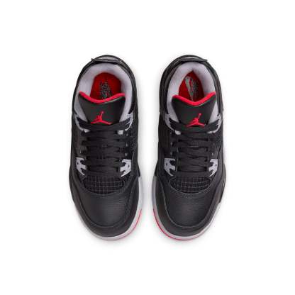 The Jordan 4 Retro Bred Reimagined (PS) is a kid-sized version of the iconic Air Jordan 4, featuring a sleek black leather upper with bold red accents. The mesh panels provide breathability, while the Cement Gray details offer a throwback to the original design. These comfortable and stylish sneakers are perfect for young Jordan fans.